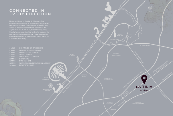 يتمتع مشروع لاتيليا فيلانوفا دبي – La Tilia Villanova Dubai بموقع استثنائي في قلب دبي لاند، بالقرب من أهم المحاور المرورية في الإمارة، ما يمنح السكان سهولة تنقل عالية دون التأثير على هدوء الحياة اليومية.